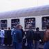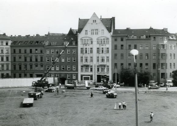 A view of the former border strip at Engelbecken; workers dismantling the Wall with building machinery in the background