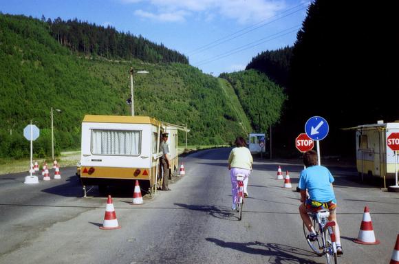 Fahrradfahrer am Grenzübergang zwischen Lauenstein, einem Stadtteil der bayerischen Stadt Ludwigsstadt, und der thüringischen Gemeinde Probstzella. Die Öffnung des Grenzübergangs fand am 12. November 1989 für Fußgänger und am 13. November 1989 für den Straßenverkehr statt. Die Aufnahme entstand in der Nähe des Felsens Falkenstein, der dem Grenzübergang den Namen gibt.