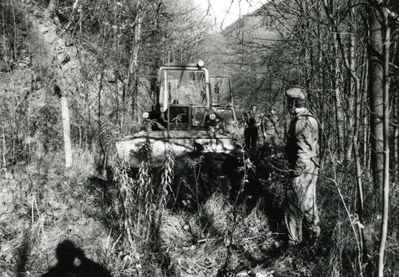 Straßenarbeiten am Grenzübergang Falkenstein zwischen Lauenstein, einem Stadtteil der bayerischen Stadt Ludwigsstadt, und der thüringischen Gemeinde Probstzella. Die Öffnung des Grenzübergangs fand am 12. November 1989 für Fußgänger und am 13. November 1989 für den Straßenverkehr statt. Die Aufnahme entstand in der Nähe des Felsens Falkenstein, der dem Grenzübergang den Namen gibt.