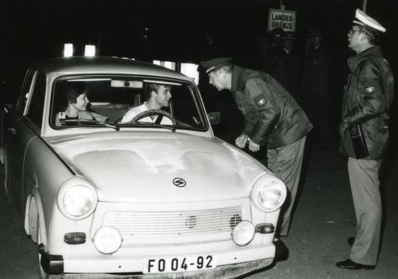 Einreise von DDR-Bürgern am Grenzübergang Falkenstein zwischen Lauenstein, einem Stadtteil der bayerischen Stadt Ludwigsstadt, und der thüringischen Gemeinde Probstzella. Die Öffnung des Grenzübergangs fand am 12. November 1989 für Fußgänger und am 13. November 1989 für den Straßenverkehr statt. Die Aufnahme entstand in der Nähe des Felsens Falkenstein, der dem Grenzübergang den Namen gibt.