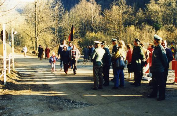 Am Grenzübergang Falkenstein zwischen Lauenstein, einem Stadtteil der bayerischen Stadt Ludwigsstadt, und der thüringischen Gemeinde Probstzella. Die Öffnung des Grenzübergangs fand am 12. November 1989 für Fußgänger und am 13. November 1989 für den Straßenverkehr statt. Die Aufnahme entstand in der Nähe des Felsens Falkenstein, der dem Grenzübergang den Namen gibt.
