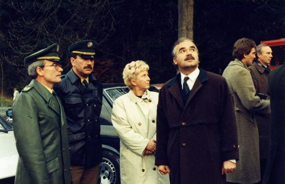 Staatssekretär Gauweiler, die Vorsitzende des Rates des Kreises Saalfeld Edith Ludwig und Polizeipräsident Hoppe am neu eröffneten Grenzübergang zwischen Lauenstein, einem Stadtteil der bayerischen Stadt Ludwigsstadt, und der thüringischen Gemeinde Probstzella. Die Öffnung des Grenzübergangs fand am 12. November 1989 für Fußgänger und am 13. November 1989 für den Straßenverkehr statt. Die Aufnahme entstand in der Nähe des Felsens Falkenstein, der dem Grenzübergang den Namen gibt.