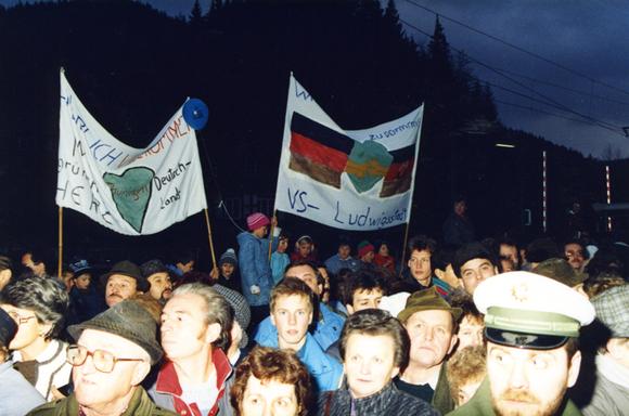 Feierlichkeiten am Grenzübergang Falkenstein zwischen Lauenstein, einem Stadtteil der bayerischen Stadt Ludwigsstadt, und der thüringischen Gemeinde Probstzella. Die Öffnung des Grenzübergangs fand am 12. November 1989 für Fußgänger und am 13. November 1989 für den Straßenverkehr statt. Die Aufnahme entstand in der Nähe des Felsens Falkenstein, der dem Grenzübergang den Namen gibt.