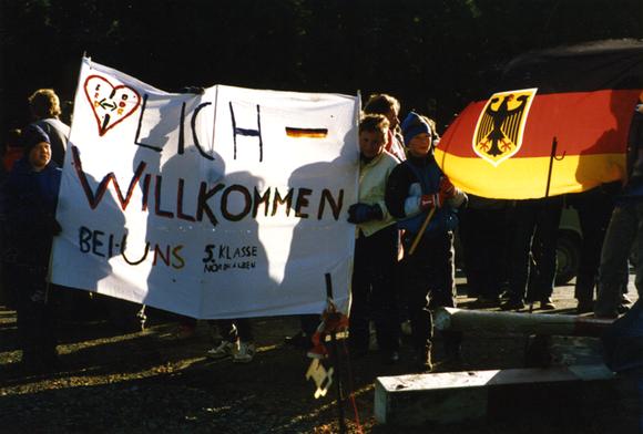 Kinder mit einem Transparent am Grenzübergang zwischen Nordhalben im bayerischen Landkreis Kronach und Bad Lobenstein im thüringischen Saale-Orla-Kreis, der am 18. November 1989 eingerichtet wurde
