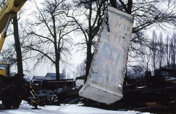 Abtransport eines Mauersegmentes auf dem Gelände einer ehemaligen NVA-Kaserne in Berlin-Rummelsburg, wo im Zuge des Mauerabbaus von der Bundeswehr Mauersegmente verkauft wurden;zwei dieser Mauersegmente sind nach einer Schenkung des Künstlers Daniel Boulogne im Museum "Le Mémorial de Caen" (