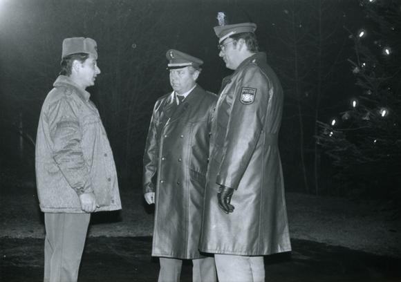 Zwei Polizisten und ein Grenzsoldat bei der offiziellen Eröffnung des bereits am 19. November 1989 eingerichteten Grenzübergangs zwischen dem bayerischen Welitsch und Heinersdorf, einem Ortsteil der thüringischen Gemeinde Judenbach. Während der Deutschen Teilung lag Heinersdorf im Schutzstreifen, am südlichen Ortsrand wurde eine Betonmauer ähnlich der Berliner Mauer errichtet. Siehe auch