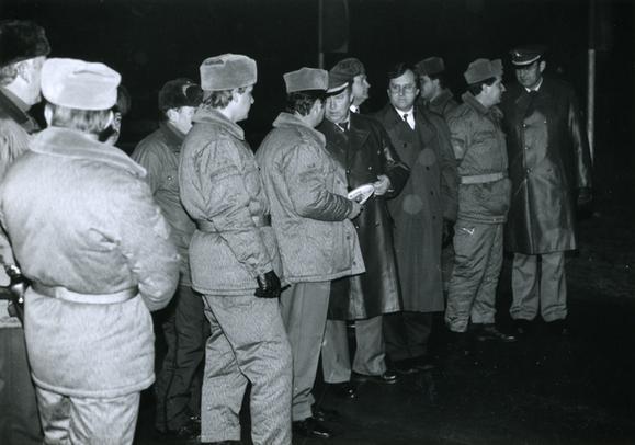 Police officers and a border patrol officer at the official opening of the border crossing between Welitsch (Bavaria) and Heinersdorf, a neighborhood of the town Judenbach (Thuringia), which had already been installed on 19 November 1989. During German separation, Heinersdorf was located in a prohibited area, and at the southern border of the town there was a concrete wall similar to the Berlin Wall.