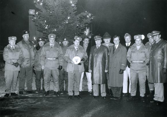 Police officers and a border patrol officer at the official opening of the border crossing between Welitsch (Bavaria) and Heinersdorf, a part of the town of Judenbach (Thuringia), which had already been installed on 19 November 1989. During German separation, Heinersdorf was located in a prohibited area, and at the southern border of the town there was a concrete wall similar to the Berlin Wall.