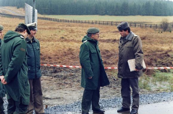 Beamte des Bundesgrenzschutzes und ein Grenzsoldat am Grenzübergang zwischen Spechtsbrunn, einem Ortsteil der Thüringer Gemeinde Oberland am Rennsteig, und dem bayerischen Tettau, der am 24. November 1989 eingerichtet wurde