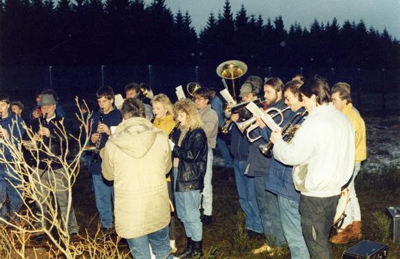 A brass band plays at the opening of the border crossing between Tschirn (Bavaria) and Brennersgrün, a part of the town Lehesten (Thuringia).
