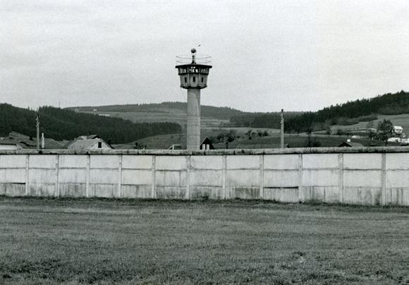 Wachtturm hinter einer der Berliner Mauer ähnlichen Betonmauer, die am südlichen Ortsrand von Heinersdorf, das während der Deutschen Teilung im Schutzstreifen lag, errichtet wurde. Am 19. November 1989 wurde zwischen Heinersdorf und dem bayerischen Welitsch ein neuer Grenzübergang eingerichtet. Siehe auch Wikipedia: Heinersdorf (Judenbach), Stand 11.8.2009