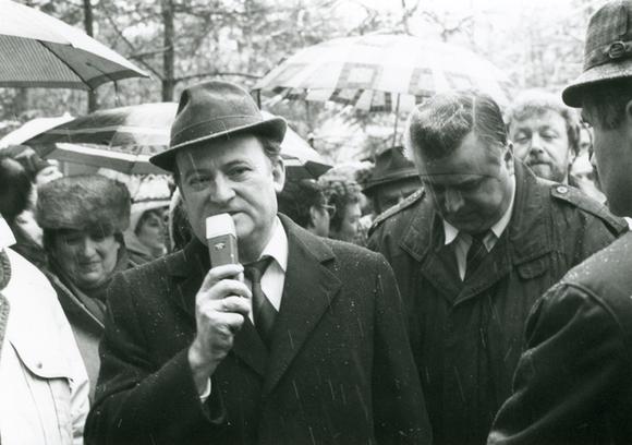 MdB Otto Regenspurger spricht bei der Eröffnung des Grenzübergangs zwischen Rotheul, einem Ortsteil des thüringischen Neuhaus-Schierschnitz, und dem bayerischen Bächlein am 31. März 1990.