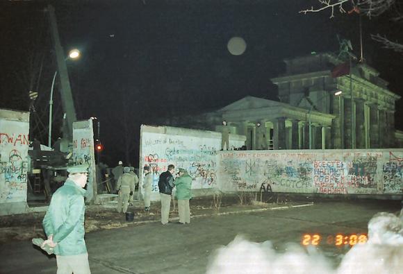 The dismantling of the first Wall segments for the new border crossing at Brandenburg Gate, which was opened in a ceremony on 22 December 1989. Over 100,000 people and hundreds of camera teams attended the ceremony, presided over by former Chancellor Helmut Kohl and Chairman of the GDR Council of Ministers, Hans Modrow.