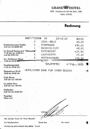 Grand Hotel / DDR Friedrichstraße 158-164, Berlin - 1080 / Telefon 20920 / Rechnung / Hotelrestaurant Coelnn / 6.00 Uhr bis 24.00 Uhr / Le Grand Restaurant "Silhouette" / 11.30 Uhr bis 16.00 Uhr / und ab 19.00 Uhr / Zur Goldenen Gans / 11.00 Uhr bis 24.00 Uhr / Forellenquintett / 11.00 Uhr bis 24.00 Uhr / Stammhaus Kindl / 10.00 Uhr bis 24.00 Uhr / Café Bauer / 7.00 Uhr bis 1.00 Uhr / La petit fleur / 6.00 Uhr bis 1.00 Uhr / Hallenbar / 8.00 Uhr bis 24.00 Uhr / Foyerbar / Open end / Gast/Tisch# 10 23-12-89 #0030 / 2 Couv.-Geld *3.00 / 4 Stammhaus *30.00 / 1 Grünkohlsupp[e] *8.05 / 1 Entenbrust *27.90 / 1 Lauchsuppe *7.10 / 1 Rostbratwurs[t] *15.30 / 1 Geb[...] *5.50 / Summe *96.85 / Herzlichen Dank für Ihren Besuch / Kellner [...] / Wir danken Ihnen für Ihren Besuch! / Auf Wiedersehen Good bye Au revoir / VV Halle Ag 309/87/15445/87 150,0 (20966) III/4/14