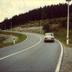 The country road at the national border between Bavaria and Thuringia; a watchtower and border security fence in the background on the right