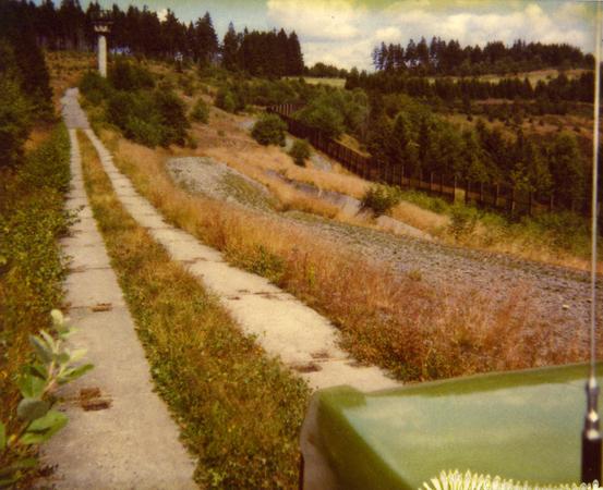 Kolonnenweg im ehemaligen Grenzstreifen mit Wachtturm und Resten des Grenzsicherungszauns (rechts)