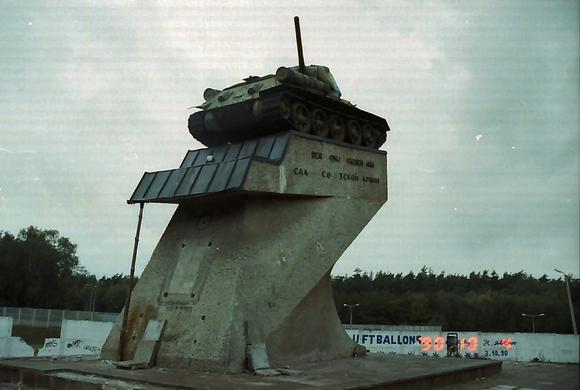 Das sowjetische "Panzerehrenmal" vor der Mauer am Grenzübergang Dreilinden/Drewitz (Checkpoint Bravo) an der ehemaligen Transitautobahn zwischen West-Berlin und der Bundesrepublik Deutschland. "Nach 1990 nahm die abziehende sowjetische Armee den geschichtsträchtigen Panzer, der am 24. April 1945 als erster die Stadtgrenze zu Berlin überfahren haben soll, wieder mit." (