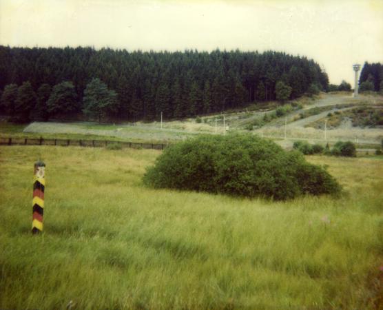 The former inner German border; a boundry post in the foreground; the border security fence and a watchtower in the background