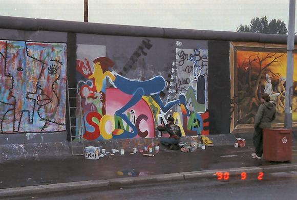 Greta Csatlós (Künstlergruppe Ciccolina) bei der Arbeit an dem Mauerbild "Sonic Malade" an der 1,3 km langen East Side Gallery in Berlin-Friedrichshain; daneben die Mauerbilder "O Povo Unido Nunca Mais Sera Veicido" von Joaquim Antonio Gocalves Borregana (rechts) und "Vergesst mir die Liebe nicht" von Henry Schmidt (links) (angeschnitten)