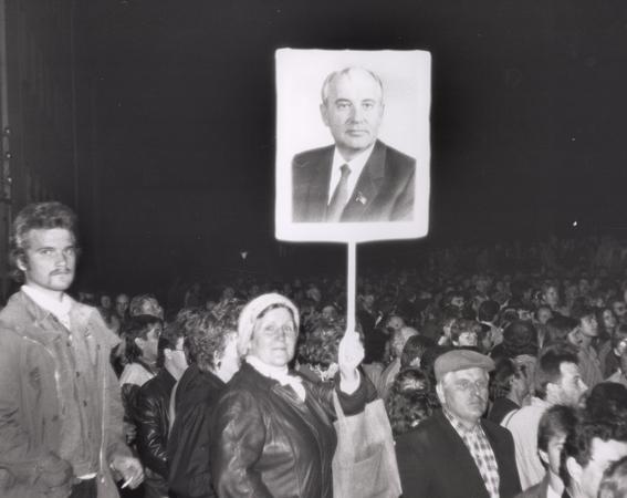 Demonstrantin mit Gorbatschow-Plakat bei einem der Friedensgebete, die seit Oktober 1989 wöchentlich vor der Neubrandenburger Johanniskirche stattfanden. Siehe auch NDR 1 Radio MV: Friedliche Revolution im Bezirk Neubrandenburg, Stand 18. Mai 2009)