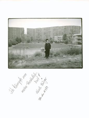 A hand-developed photograph of a young woman standing in front of a row of "Plattenbau" (prefabricated concrete) buildings, with an inscription underneath