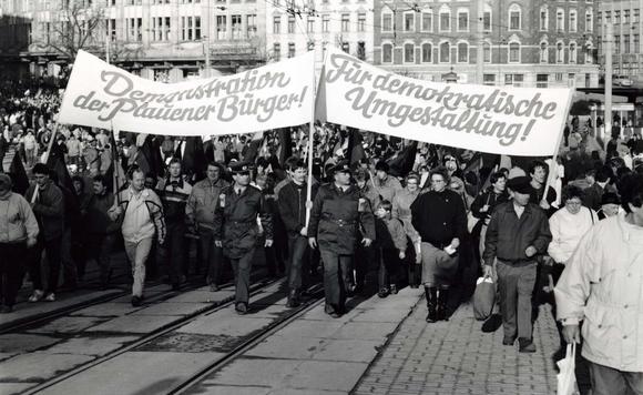Banner,"Citizens of Plauen for democratic reformation". Demonstrators with a banner, presumably taken during one of the mass protests in Plauen (Saxony), that were held every Saturday from 7 October 1989 until the first democratic elections took place on 18 March, 1990. (retreived and translated from