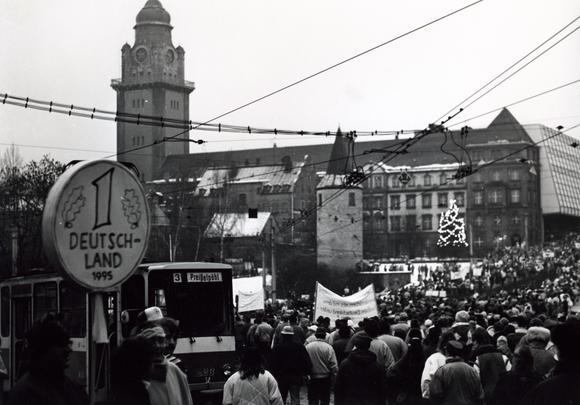 Demonstranten vor dem Rathaus, vermutlich aufgenommen im Rahmen einer der Großdemonstrationen in Plauen, die vom 7. Oktober 1989 bis zu den ersten freien Wahlen am 18. März 1990 an jedem Samstag stattfanden. Siehe auch