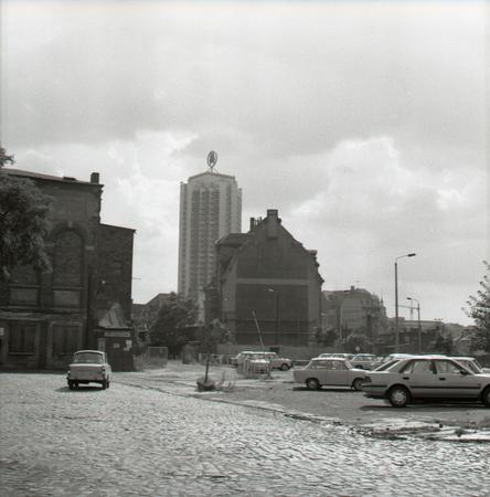 Autos auf einem Parkplatz in Leipzig, im Hintergrund das Wintergartenhochhaus (