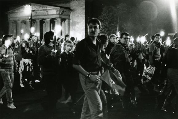 Teilnehmer mit Fackeln und Fahnen beim FDJ-Fackelzug zum 40. Jahrestag der DDR