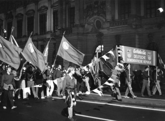Participants with flags and flaming torches at a FDJ (Free German Youth) torchlight procession to celebrate the 40th anniversary of the GDR