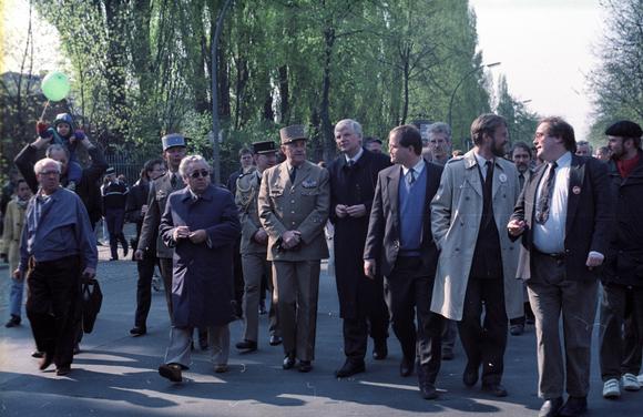 In der Bildmitte der französische Stadtkommandant General Cann, der damalige Bezirksbürgermeister von Reinickendorf Detlef Dzembritzki und der von Februar bis Juni 1990 im Auftrag des Runden Tisches als Bezirksbürgermeister von Pankow amtierende Nils Busch-Petersen (v.l.n.r.) bei der Eröffnungsfeier des Grenzübergangs Kopenhagener Straße (Niederschönhausen-Wilhelmsruh/Reinickendorf),At the Kopenhagener Straße border opening (Niederschönhausen-Wilhelmsruh/Reinickendorf). In the center: General Cann, then French town major, Detlef Dzembritzki, then borough mayor of Rienickendorf and Nils Busch-Petersen, then borough mayor of Pankow as assigned by the "Zentraler Runder Tisch" ("Central Round Table") organized by the East German political movement "Demokratie Jetzt" ("Democracy Now")