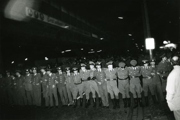 A row of police at the demonstration held for the 40th anniversary of the GDR at Schönhauser Allee railway station