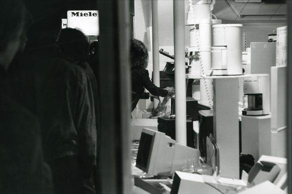 The looting of an electronics store during a demonstration at Alexanderplatz. The demonstration was part of a series organized by autonomist groups entitled "Aktionstage für den Wiederzusammenbruch" ( "Action days for the 'reunifiasco'") held from 30 September - 3 October 1990, at which approx. 15,000 people took part.