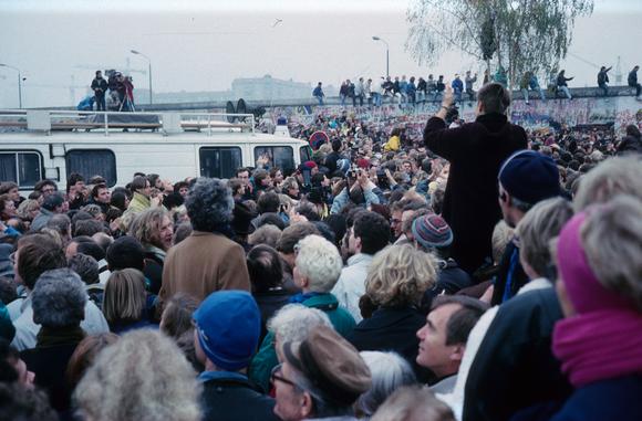 A crowd of people at the border opening at Potsdamer Platz on 12 November 1989