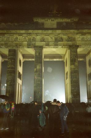 Woman and child in front of a crowd at Brandenburg Gate border crossing, festively opened on December 22, 1989. The opening ceremony was carried out by Helmut Kohl and the East German premier, Hans Modrow, and attracted more than 100,000 onlookers and hundreds of camera teams.