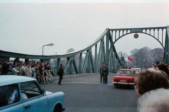 Border guards and pedestrians on Glienicke Bridge, the bridge connecting the cities of Berlin and Potsdam across the Havel River. On 10 November 1989 it was once again open to East German citizens for the first time since 1961.
