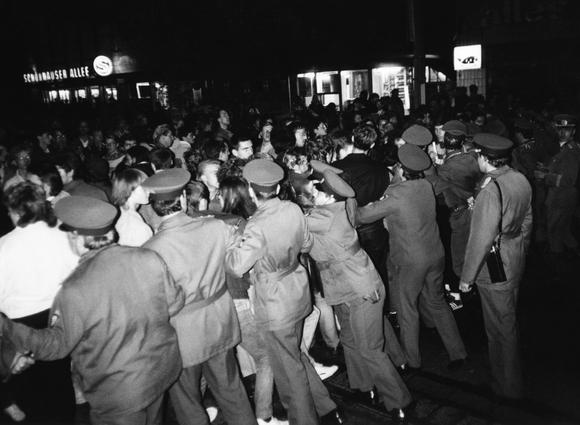 Confrontation between police and demonstrators at an unauthorized demonstration on the evening of the 40th anniversary of the GDR