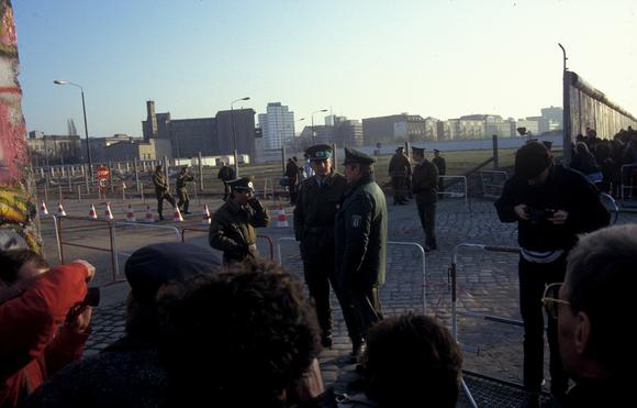 Grenzsoldaten und Westberliner Polizist am neuen Grenzübergang am Potsdamer Platz