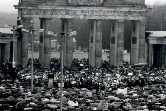 Menschenmenge am neuen Grenzübergang Brandenburger Tor, der am 22. Dezember 1989 feierlich eröffnet wurde. Zur Grenzöffnung durch den damaligen Bundeskanzler Helmut Kohl und den Vorsitzenden des DDR-Ministerrates Hans Modrow erschienen hunderte Kamerateams und mehr als 100.000 Menschen.