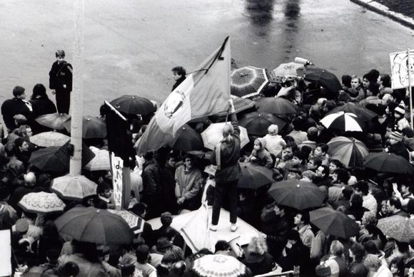 A crowd at the new Brandenburg Gate border crossing, which was opened in a festive ceremony on 22 December 1989. Hundreds of camera teams and over 100,000 people attended the ceremony presided over by then BRD Chancellor Helmut Kohl and the then GDR Chairman of the Council of Minsters Hans Modrow.