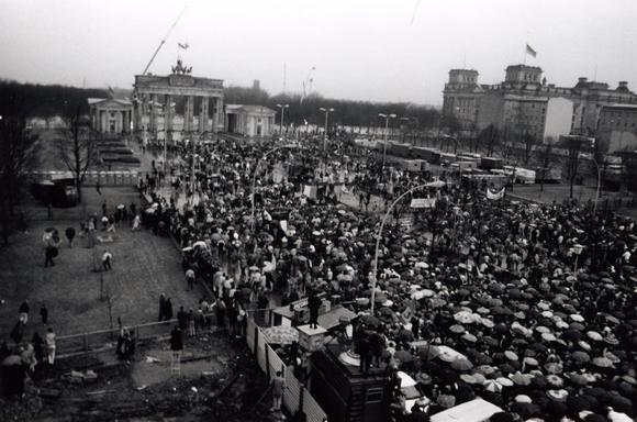 Crowds of people at the Brandenburg Gate border crossing, festively opened on 22 December 1989. Hundreds of camera teams and more than 100,000 people attended the border opening ceremony led by the then Bundeskanzler, Helmut Kohl and the East German premier, Hans Modrow.