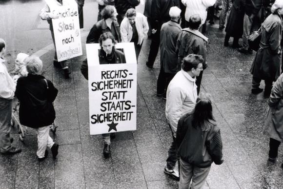 Protestors with banners at the Alexanderplatz demonstration, "the largest anti-government demonstration(s) in the history of the GDR" (retrieved and translated from