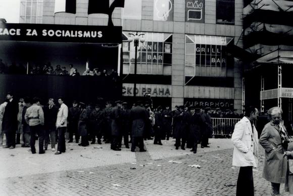 "Excursion to Prague. The official May Day demonstration was greatly disrupted by counter-protestors, there were clashes with the police. This photo shows the still massive presence of police and security forces beside the official May Day .
