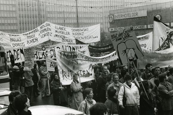 Demonstranten mit Transparenten vor dem Interhotel DDR (heute Park Inn) bei der Alexanderplatz-Demonstration, der "größte[n] nicht staatlich gelenkte[n] Demonstration in der Geschichte der DDR" (