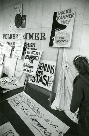 Protest posters and banners at the entrance to the People's Parliament in Palast der Republik (Palace of the Republic)