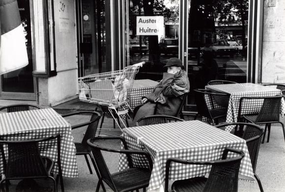 "The picture of an elderly woman with a shopping trolley was taken on the Kurfürstendamm in the morning of 3 October 1990. It was around 9 o'clock and the avenue was still deserted. I left my guesthouse in the Mommsenstraße and was on my way to the former border crossing at Checkpoint Charlie. It was cool and I very nearly walked past this scene when I stopped and walked back a couple of paces. Social extremes meet right here on the boulevard."