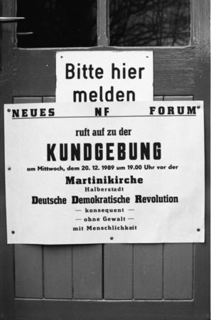Neues NF Forum / ruft auf zu der / Kundgebung / am Mittwoch, dem 20.12.1989 um 19.00 Uhr vor der / Martinikirche / Halberstadt / Deutsche Demokratische Revolution / - konsequent - / - ohne Gewalt - / mit Menschlichkeit
