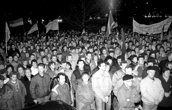 Demonstration vor der Martinikirche, die 1989 auch als Versammlungsort des Neuen Forums genutzt wurde