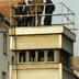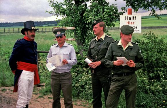 Kutschfahrer in historischer Uniform, Grenzsoldat und Bundespolizisten am Grenzübergang