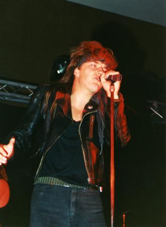Mike Kilian, Bandleader und Sänger der Ostberliner Band "Rockhaus", während der "Berliner Rocknacht" in der Mehrzweckhalle Schretzheim